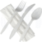 These white cutlery kits are designed to provide a complete dining solution in a convenient, all-in-one package. Each kit includes a fork, knife, and napkin, all individually wrapped to ensure hygiene and ease of use. The utensils are crafted from durable polypropylene, offering strength and reliability for various dining needs. The sleek white color adds a touch of sophistication, making them suitable for both casual and formal settings. Ideal for takeout, catering, and foodservice operations, these kits streamline meal preparation and enhance the dining experience for customers.